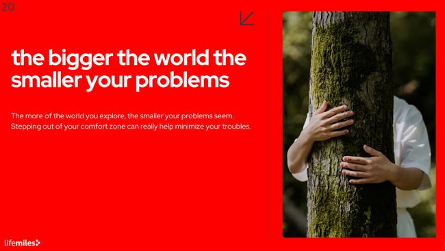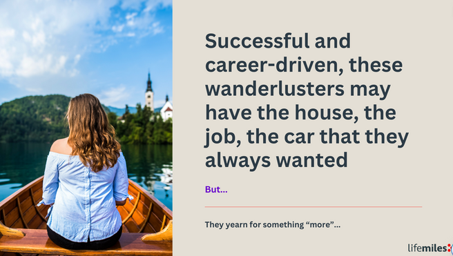The bigger the world the smaller your problems. Create a multi-channel marketing campaign that engages millennial wanderlusters by using inspiring social media content, providing authentic information, highlighting unique travel experiences, and fostering a community for sharing travel stories. This approach connects financial benefits with emotional rewards, aligning with their desire for meaningful travel.